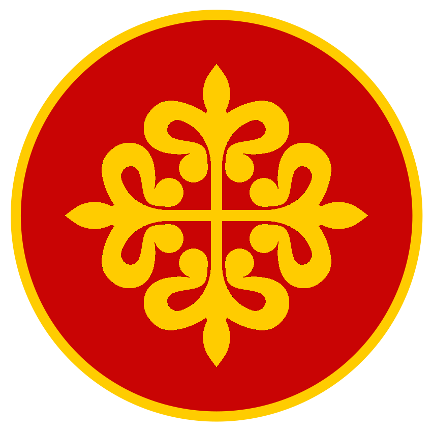 The kings of Spain bore as a crest the tower of Castile from which emerges a purple lion, rising, with a silver sword cross-hilted and pommelled in gold in the right paw, and in the left sometimes a red shield, sometimes a golden globe. These heraldic elements are difficult to stylize and not easily distinguishable from those of other communities. Here we depict instead a simple and well-known sign — the floriated cross of the type known as Alcántara or Calatrava — akin to motifs in folk art, a symbol common to the various Spanish-speaking regions.